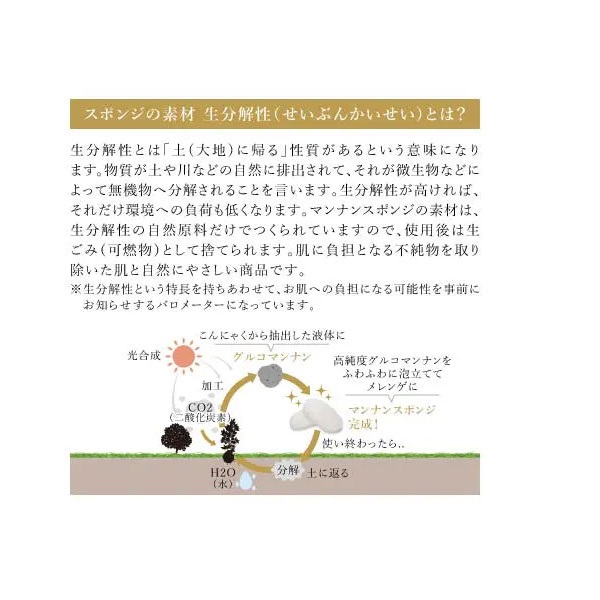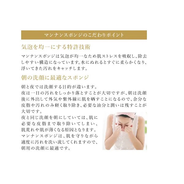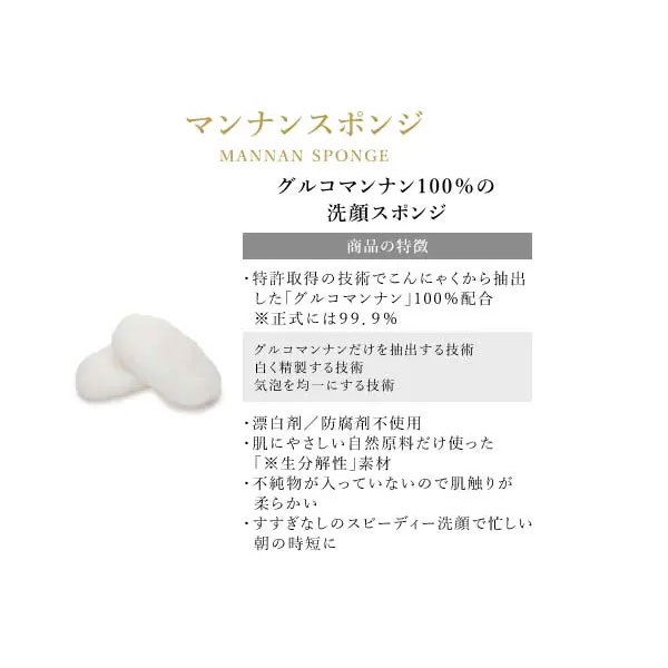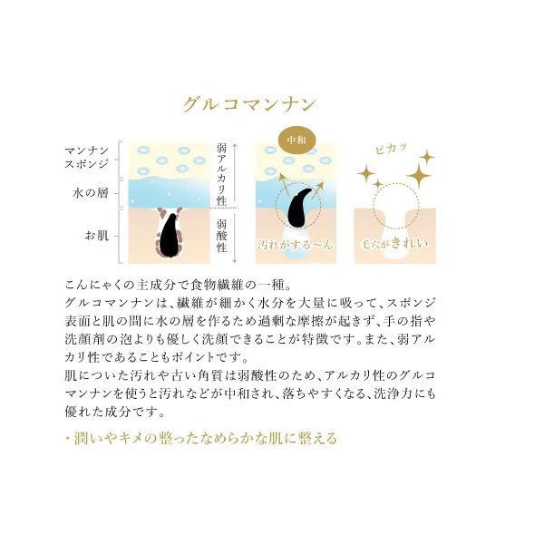 3つの特許を取得した新技術で抽出したグルコマンナン100%の朝専用スポンジ。グルコマンナンが本来持つ高い保湿力と、優れた洗浄力でキメの整った化粧のりの良い肌に。