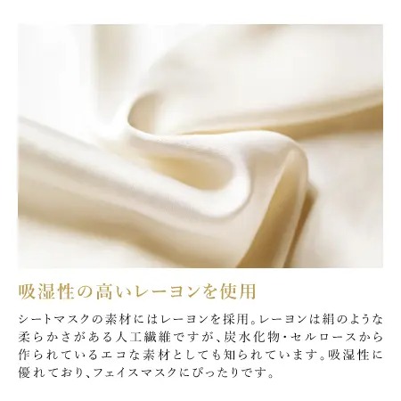 レーヨンは絹のような柔らかさがある人工繊維ですが、炭水化物・セルロースから作られているエコな素材としても知られています。吸湿性に優れており、フェイスマスクにぴったりです。
