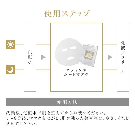 洗顔後、化粧水で肌を整えてからご使用ください。5~8分後にマスクをはがし、肌に残った美容液は優しくなじませてください。